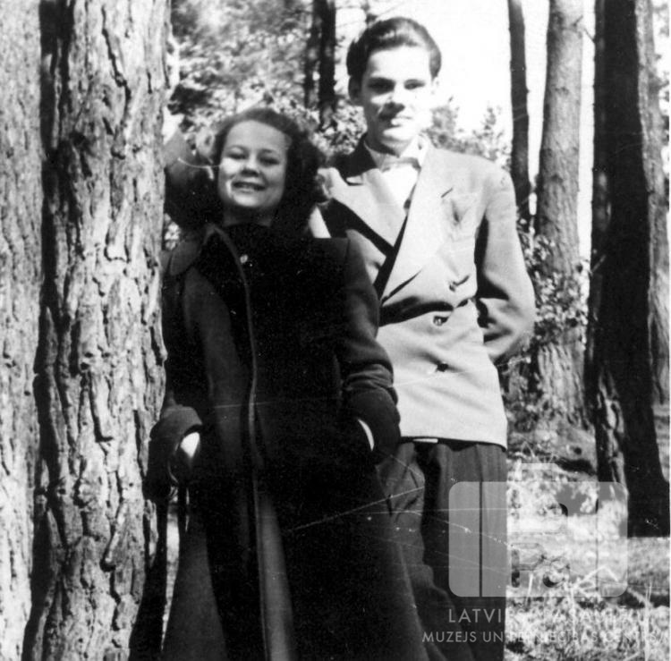 Divi jaunieši no Ventorfas nometnes (angļu zonā) mežā pie koka. No kreisās: nezināms un Edgars Zariņš jun.