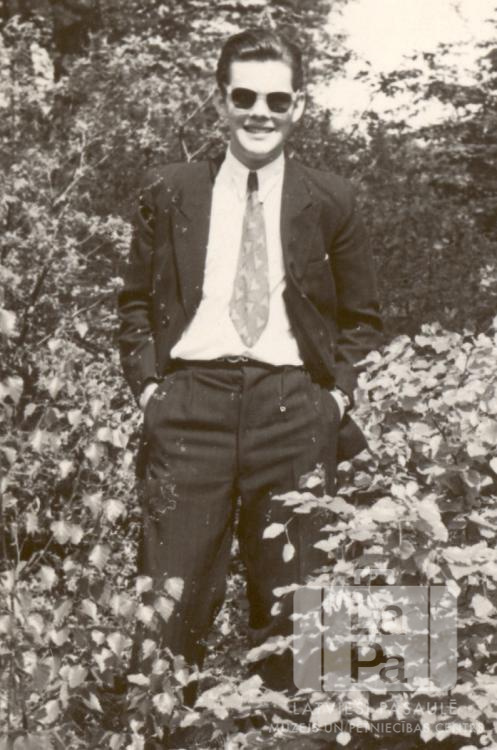 Edgars Zariņš jun. uzvalkā, šlipsē un tumšās saulesbrillēs krūmu vidū Ventorfas nometnē (angļu zonā). Foto autors: Silva Pankare.