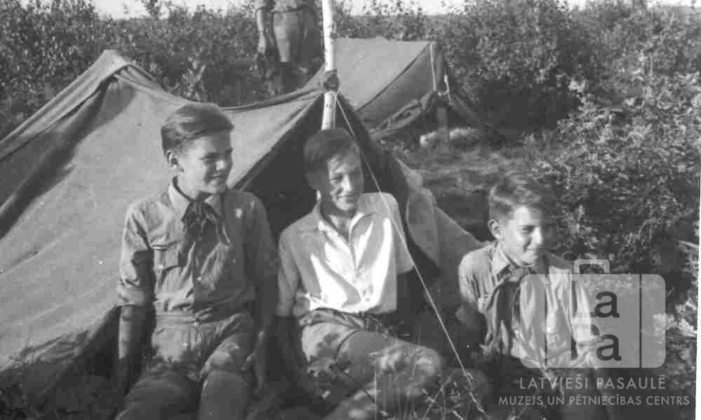 Trīs skauti formastērpos no Vēdeles nometnes (angļu zonā) sēž paštaisītas telts priekšā krūmos 1947. gada vasarā. Fonā redzama telts un vīrieša stāvs (līdz jostasvietai). No kreisās: Edgars Zariņš jun., Guntis Priedītis un Silvestris Zariņš. Foto autors: Jānis Rostoks.