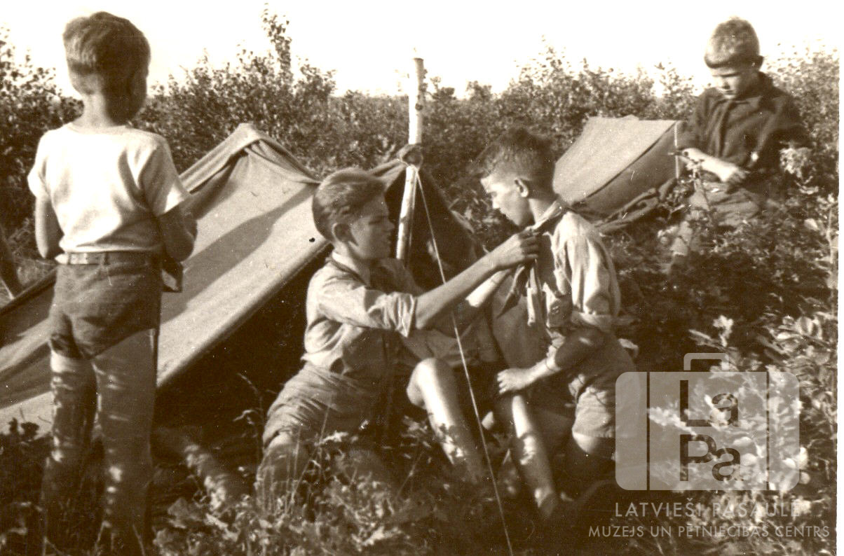 Četri zēni no Vēdeles nometnes (angļu zonā) pie paštaisītām teltīm krūmos 1947. gadā. Vidū zēns skautu uniformā (Edgars Zariņš jun.) kārto kaklautu otram skautu zēnam (Silvestris Zariņš). Foto autors: Jānis Rostoks.
