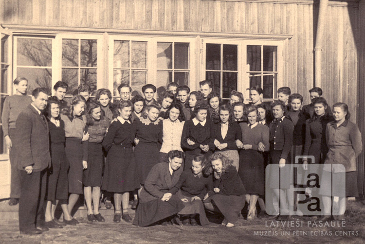 Ģimnāzijas 2. klases skolēni ar audzinātāju pie kokas ēkas logiem Pinnebergā (angļu zonā) 1948. gada rudenī. Priekšā, no kreisās: Ruta Blūmberga, Maija Ābele un Maija Zariņa (pr. Grosc). Otrajā rindā, no kreisā: klases audzinātājs N. Lazdiņš, Dace Špīlberga, Aina Poriete, Guna Kazīņa, Maruta Haznere, Ilga Bērziņa, Maija Ozola, Ruta Priedkalne, Ruta Grava, Velīme Kirimova, Ārija Buklovska, Ināra Endziņa, Mudīte Lūse, Biruta Upatniece, Mudīte Pētersone, Inese Šulce, Ausma Rudzīte, Genoveva Greize, Maija Noriņa, Maija Grāvīte, Elza Grāvīte un Austra Miķelena. Aizmugurē, no kreisās: Ilmārs Upītis, Gunārs Gāle, Pauls Lucavs, Jānis Krūmiņš, Pāvils Dunckis, Arnis Kauliņš, Kārlis Dzelmanis, Juris Orle, Edvīns Hincbergs, Andris ? un Edgars Zariņš jun.