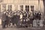 Neformāla bilde, ģimnāzisti stāv 3 rindās ārpus ēkas ar lieliem logiem, trīs jaunietes tup priekšā
