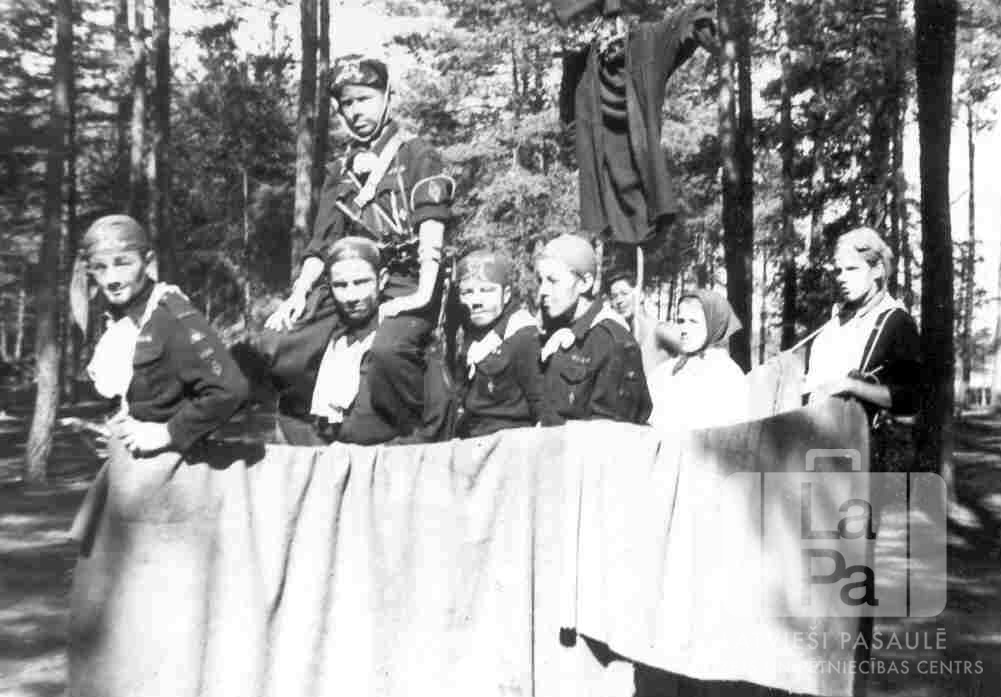 Septiņi skauti no Pinnebergas nometnes pirātu kostīmos mežā pie Fišbahas nometnes (angļu zonā) 1949. gada vasarā. Skauti atveido kuģi; fonā redzams jaunietis, kas tur uz kārts uzkārtu mēteli ("buru"). Viens skauts "kuģī" sēž otram skautam uz pleciem. Uz pleciem sēž Silvestris Zariņš. Kuģa aizmugurē ir Edgars Zariņš jun.