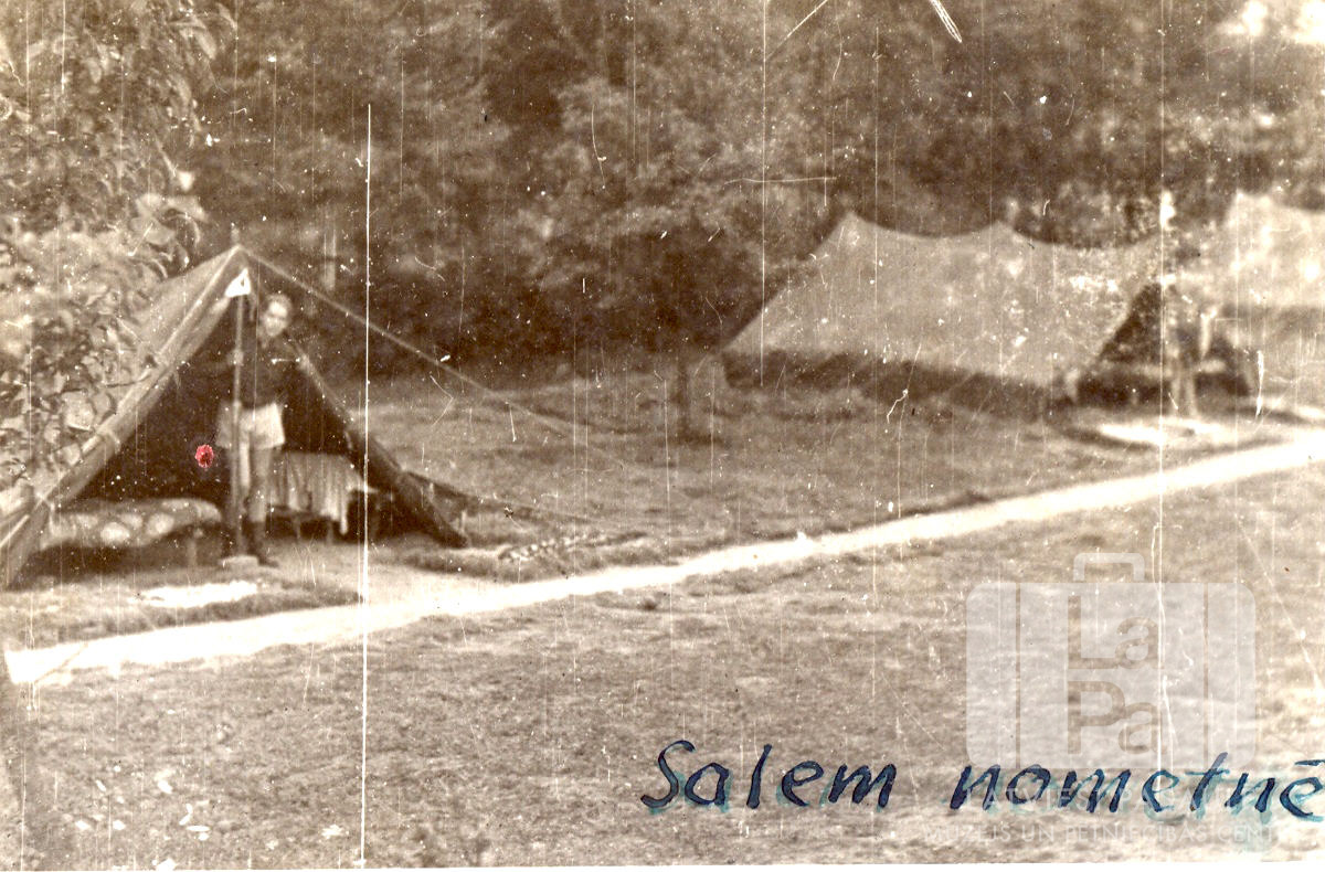 Divas uzslietas teltis skautu nometnē Salemas tuvumā skautiem no Vēdeles (angļu zonā) 1946. gada vasarā. Kreisajā pusē pie telts ieejas stāv zēns skautu formastērpā. Fotogrāfijas apakšējā labajā stūrī rokrakstā ar zilu pildspalvu ir rakstīts "Salem nometnē".
