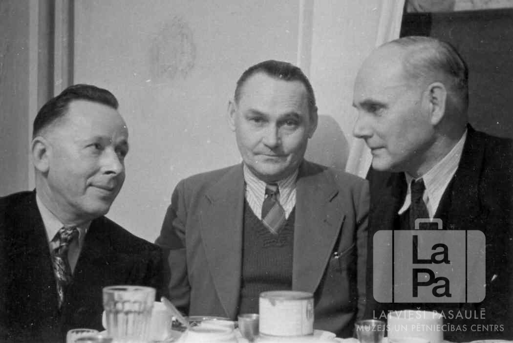Trīs vīrieši uzvalkos – Ventorfas nometnes 8. bloka vadība – sēž pie galda Ventorfas nometnē (angļu zonā). Priekšplānā uz galda ir redzamas kafijas tases. No kreisās: flotes aviācijas kapteinis Kārlis Ercums, 1. jātnieku pulka kapteinis Konrāds Kārkliņš un inženieris Edgars Zariņš. Foto autors: Zigurds Kārkliņš.