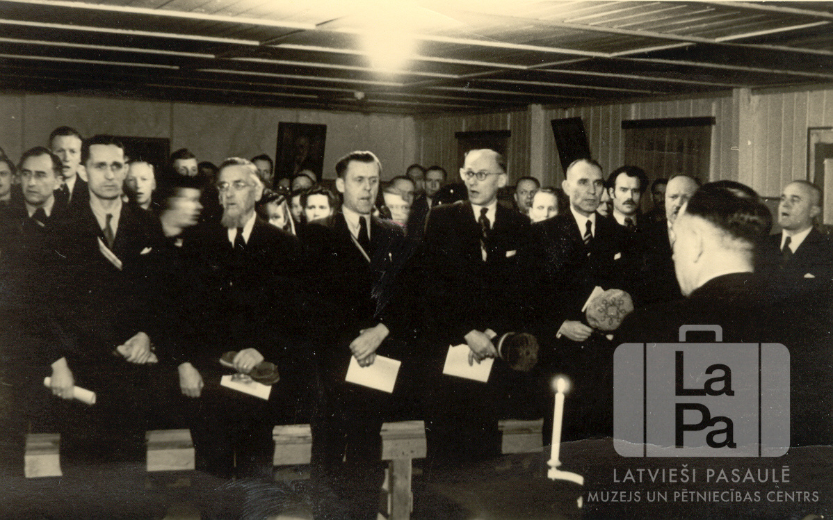 Studentu korporācijas "Patria" atsākšanas svētku akta dalībnieki un viesi Valkas nometnē Nirnbergā (amerikāņu zonā). Pirmajā rindā, no kreisās: Jānis Venners tal., Andrejs Ķeze sel., Jānis Turks vent., Kārlis Jēkabsons vent., Oskars Leimanis, Ernests Brože, nezināms. Par šo gadījumu "Patrias" filistris Edgars Zariņš jun. atceras: "Studentu korporācija Patria atsāka savu oficiālo, aktīvo darbību 1948. gadā "Valkas" DP nometnē. Fotogrāfijā redzam darbības atsākšanas svētku akta patriešus un viesus."