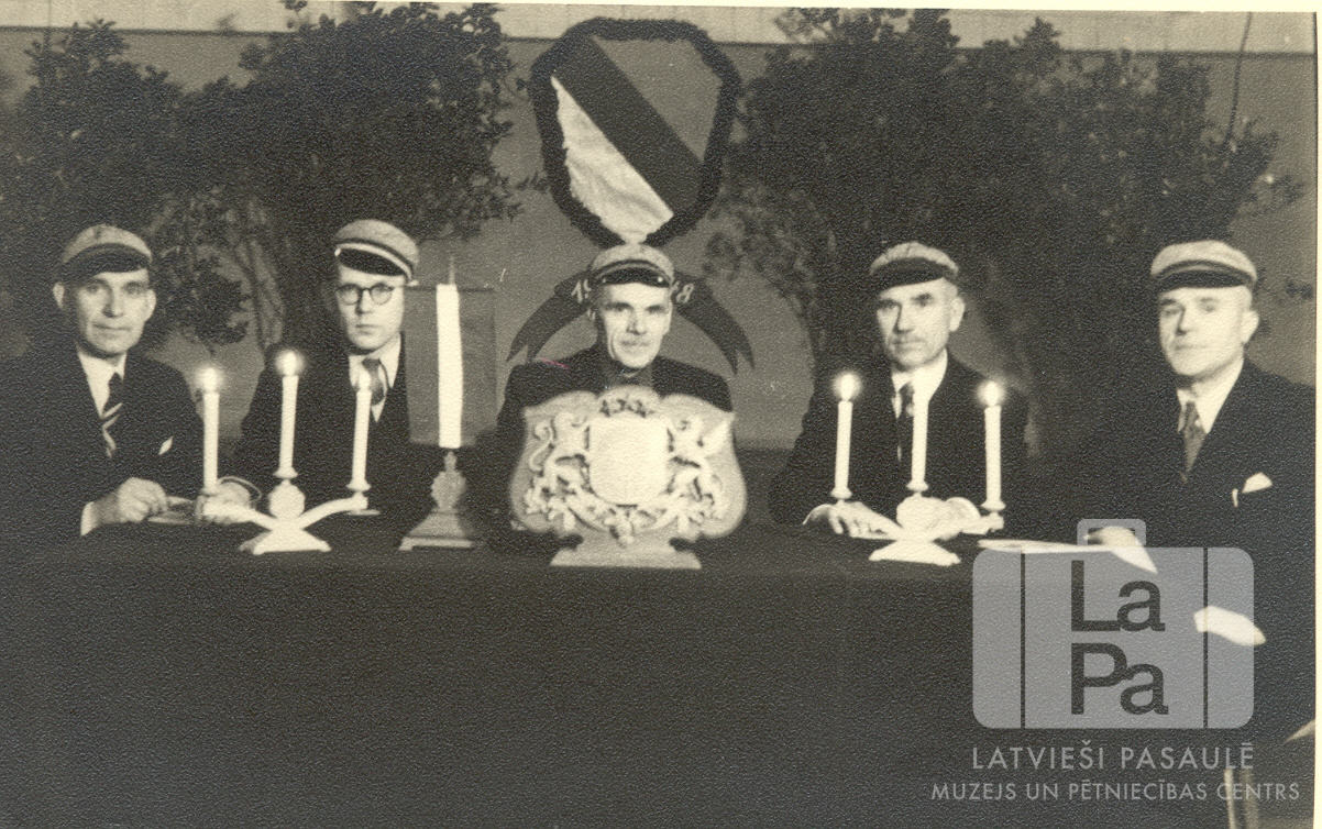 5 korporeļi sēž pie galda, galds apsegts ar tumšu galdautu, galda vidū Latvijas ģēŗbonis, trīs svečturi. Pie sienas fonā ir korporācijas ģērbonis.