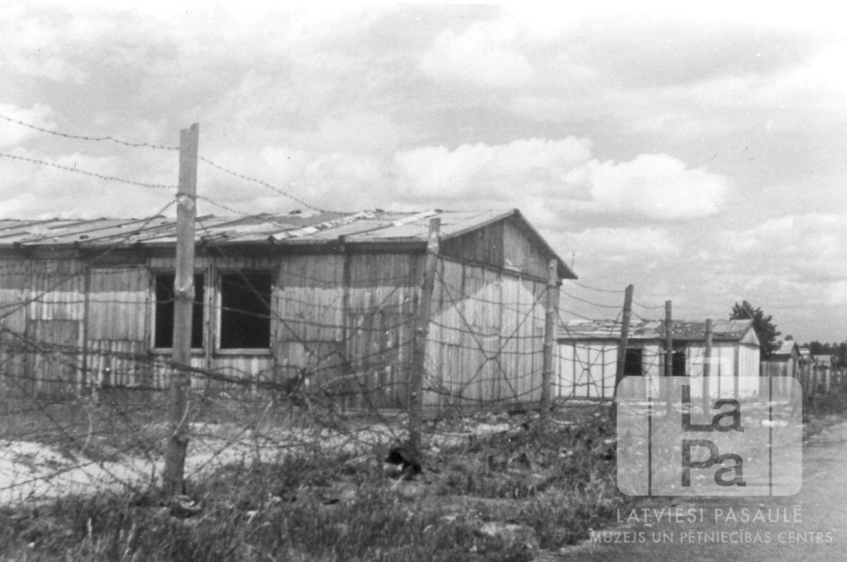Noplukušas vienstāvu koka barakas aiz dzeloņstiepļu žoga Valkas nometnē Nirnbergā (amerikāņu zonā) pirms latviešu ierašanās. Par šo gadījumu Edgars Zariņš jun. atceras: "Šis ir skats, kas sagaidīja latviešu bēgļus daudzās nometnēs."