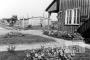 Nometnes skats Valkas nometnē (amerikāņu zonā) ar ielu, vienstāvu koka barakām un ziedošām puķu dobēm. Priekšplānā uz mājas sienas ir zīme ar salasāmu vārdu "VALKA". Tālumā gar baraku iet sieviete.