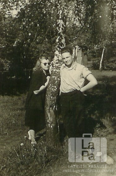 Jauns vīrietis un sieviete stāv pie bērza Pinnebergas nometnē (angļu zonā). Sievietei saulesbrilles. No kreisās: Maija Zariņa (pr. Grosc) un Pēteris Ārgalis.