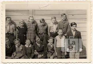 Daugavas tautskolas 4. klases bērni divās rindās pie koka barakas sienas Ansbahā (amerikāņu zonā). Pirmās rindas vidū sēž skolotāja. Pirmajā rindā, no kreisās: Ludmilla Links, Vija Veinbergs, Edīte Jakobsons (pr. Virkus), klases audzinātāja ? Jekabsons, Vitolds Cibulskis, Maigonis Dzintars, Zigurds Šmits. Otrajā rindā, no kreisās: Kārlis Robežnieks, Gunta Paupe, Inese Sestulis, Andris Bracka, Anatolijs Apaļais, Vladislavs Visockis.