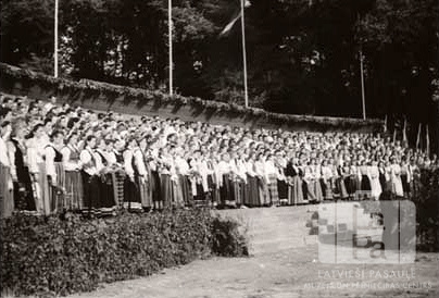 Kopkoris estrādē, koristi tautas tērpos, skatuve appušķota, virs skatuves Latvijas karogs