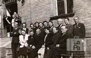 Vīrieši un sievietes divās rindās, aiz viņiem ķieģeļu ēka, kreisajā pusē trepes uz augšu uz kurām stāv bērni