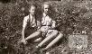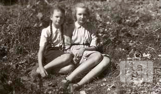 Divas meitenes sēž zālē uz pakalniņa Ansbahā (amerikāņu zonā). No kreisās: Edīte Jakobsons (pr. Virkus) un Veronika Mičulis. Par šo gadījumu Edīte Jakobsons Virkus atceras: "Uz zemes paliek vēss."