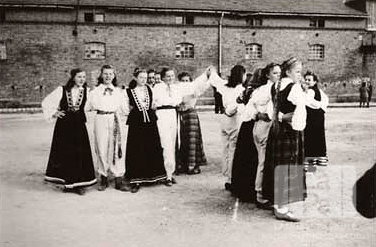 Jauniešu dejotāju grupa tautastērpos laukumā izpilda deju "sudmaliņas" Ansbahā (amerikāņu zonā). Fonā ķieģeļu ēka.