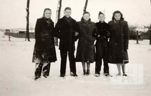 Pieci jaunieši mēteļos stāv sniegā Ansbahā (amerikāņu zonā) 1948.–1949. gadā. No kreisās: Vija Veinbergs, Auseklis Ozols, Edīte Jakobsons (pr. Virkus), Juris Teteris, Veronika Mičulis Par šo gadījumu Edīte Jakobsons Virkus atceras: "Klejojam pa Ansbahu sniegainā dienā."