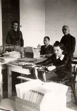 Četri organizācijas "International Refugee Organization" (IRO) darbinieki savās biroja telpās Ansbahā (amerikāņu zonā) 1948. gada beigās. Uz galdiem redzamas kastes ar dokumentiem; viena sieviete raksta ar rakstāmmašīnu. Pirmā no kreisās: Alma Jakobsons.