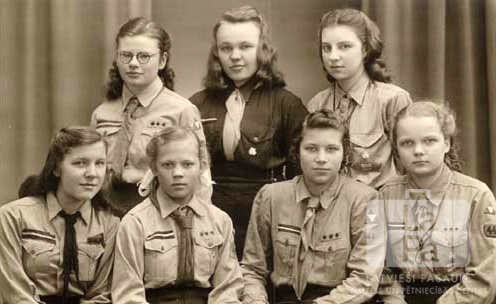 Septiņas gaidu vienības Kaiju kopa meitenes formastērpos Ansbahā (amerikāņu zonā). No kreisās: Brigita Rubess, ? Genzbigele, Zaiga Zvīgurs, Vija Veinbergs, Edīte Jakobsons (pr. Virkus), Valentīna ?, Arimonda Pape.