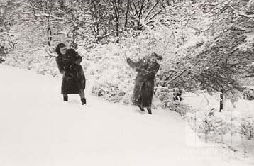 Divas meitenes garos mēteļos pikojas sniegainā ainavā Ansbahā (amerikāņu zonā). No kreisās: Edīte Jakobsons (pr. Virkus), Biruta Sūrmanis. Par šo gadījumu Edīte Jakobsons Virkus atceras: "Pēdējais sniegs Vācijā."