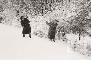 Divi cilvēki garos mēteļos pikojās sniegainā ainavā