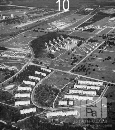 Skats no gaisa uz Valkas nometni Nirnbergā (amerikāņu zonā) ap 1948. gadu. Redzamas vairākas baraku rindas ar gaišiem jumtiem. Fotogrāfijas augšpusē uzdrukāts cipars "10".