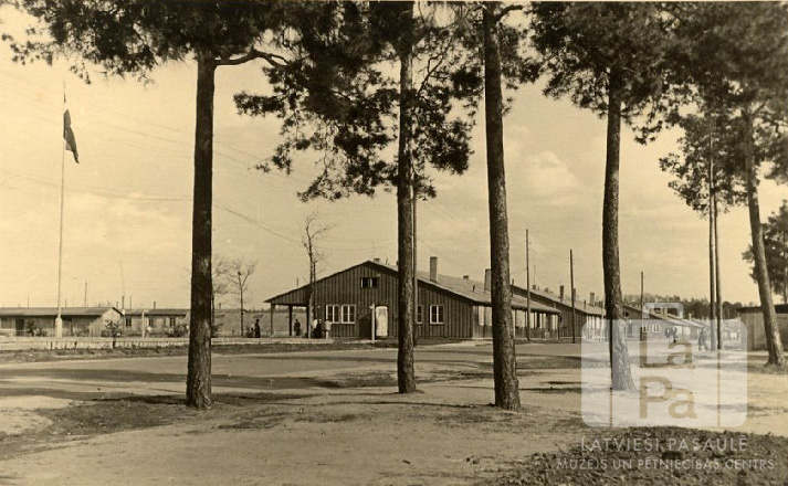 Caur kokiem redzamas Valkas nometnes Nirnbergā (amerikāņu zonā) vienstāvu barakas un kreisajā pusē karoga masts ar plīvojošu Latvijas karogu. Centrā Valkas nometnes pārvaldes baraka.