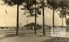Aiz kokiem redzamas vienstāvu barakas un kreisajā pusē karogu masts