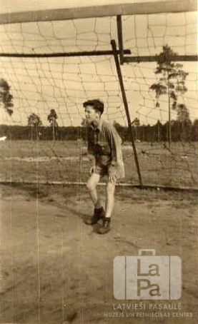 ? Nabrovskis stāv futbola vārtos Valkas nometnē Nirnbergā (amerikāņu zonā) ap 1948. gadu.