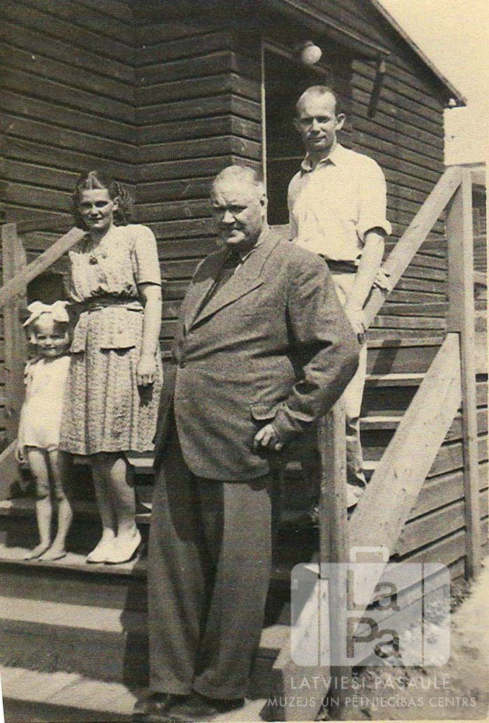 Mucnieku ģimene ar nometnes komandantu stāv uz kāpnītēm pie ieejas ēkā Pegnicas nometnē (amerikāņu zonā). No kreisās: Ilze Mucnieks (pr. Resnis), Elizabete Mucnieks (dz. Štolba), nometnes komandants Edvards Virziņš un Atis Mucnieks.