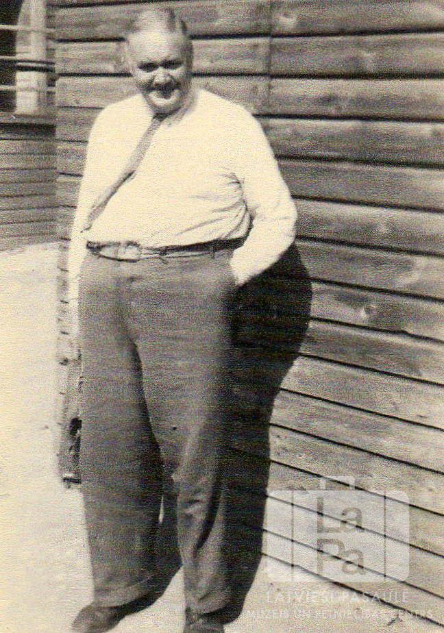 Edvards Virziņš, Pegnicas nometnes (amerikāņu zonā) komandants, stāv pie koka ēkas stūra.