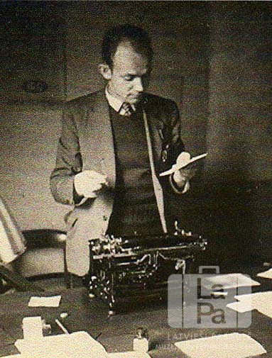 Vīrietis stāv aiz galda, viņam priekšā rakstāmmašīna.