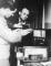 Divi vīrieši pie radioaparātiem radio labošanas darbnīcā Pegnicas nometnē (amerikāņu zonā). No kreisās: ? Ģībietis, Atis Mucnieks.