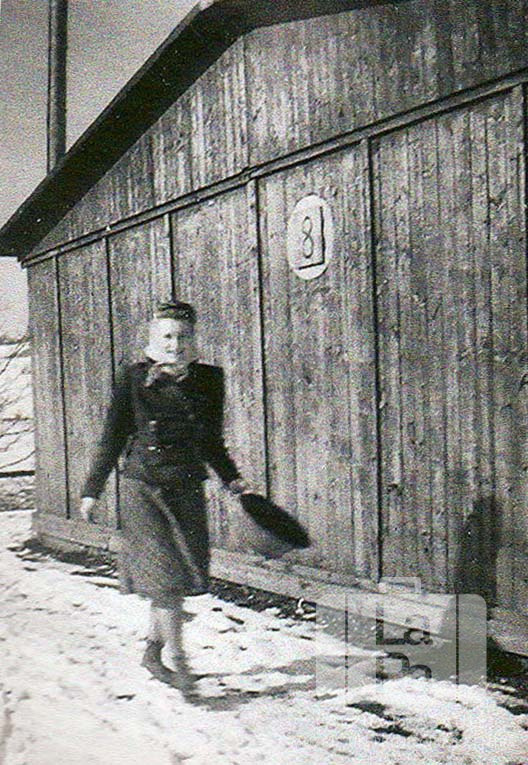 Elizabete Mucnieks (dz. Štolba) mētelī un lakatā nes dzelzs bļodu garām vienstāvu koka barakai Pegnicas nometnē (amerikāņu zonā) 1948. gada pavasarī. Uz barakas sienas piesprausta plāksne ar ciparu "8".