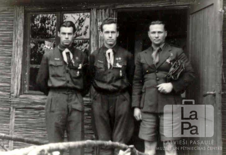Tērvetes 11. skautu vienības vadītāji formastērpos pie skautu mītnes ieejas durvīm Tērvetes nometnē Oldenburgā (angļu zonā). No kreisās: vadītāja vietnieks Zemvalds Sproģis, vadītājs Elmārs Sproģis un vienības priekšnieks vadītājs H. Kreicbergs.