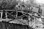Tērvetes 11. skautu vienības ierinda Tērvetes nometnē Oldenburgā (angļu zonā). Priekšplānā bērza koku tilts. Skautu priekšā vadītājs Aleksandrs Budrēvics.