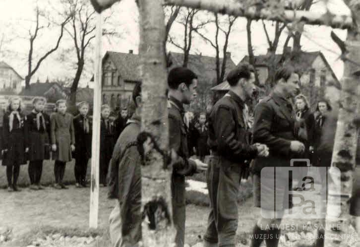 Četri vīrieši skautu formastērpos no Tērvetes 11.skautu vienības Sv. Jura dienas svinībās Tērvetes nometnē Oldenburgā (angļu zonā). Priekšplānā skatu daļēji aizsedz bērza koka veidojums. Aizmugurē stāv Mežotnes 11. gaidu vienības meitenes ierindā. Fonā ir redzamas dzīvojamās ēkas. Priekšā, no kreisās: nezināms, Zemvalds Sproģis, Elmārs Sproģis un Hugo Kreicbergs.