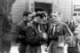 Trīs vīrieši skautu formastērpos no Tērvetes 11. skautu vienības Sv. Jura dienas svinībās Tērvetes nometnē Oldenburgā (angļu zonā). Redzamas arī meitenes no Mežotnes 11. gaidu vienības. Aizmugurē Tērvetes koka baznīcas baraka ar vaļējām ieejas durvīm. Priekšā, no kreisās: Zemvalds Sproģis, Elmārs Sproģis un Ziedonis Šuriņš.