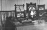 Uz galda izstādīti rokdarbi Tērvetes 11. skautu vienības darbu skatē Tērvetes nometnē Oldenburgā (angļu zonā). Redzami gleznojumi, ornamentēti šķīvji un citi prieškmeti.