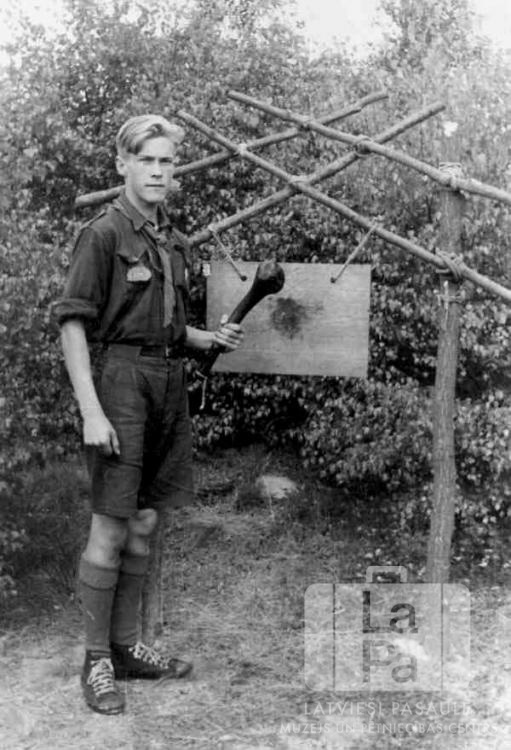 Skauts formastērpā pie signālu klabatām Tērvetes novadu skautu kopnieku un gaidu kopnieču kursos Birstaliņā pie Tērvetes nometnes Oldenburgā (angļu zonā).