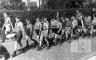 Tērvetes 11. skautu vienības mazskautu pulka zēni formastērpos dodas gājienā pa bruģētu ielu Tērvetes nometnē Oldenburgā (angļu zonā) 1947. gada pavasarī. Vienam skautam rokās bungas. Skautiem blakus iet pieaugušie; fonā dzīvžogs.