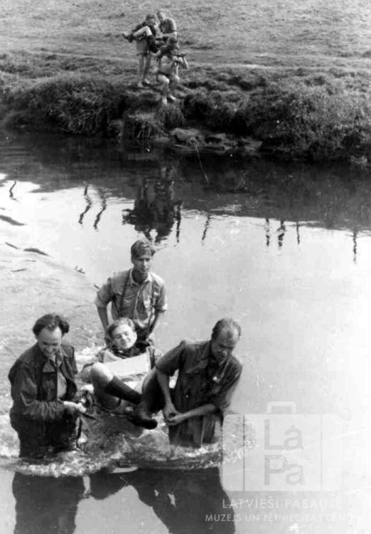Trīs vīrieši skautu formastērpos nes ceturto skautu pāri upei pirmās palīdzības mācību laikā, kas notiek Tērvetes novada vadītāju sagatavošanas kursos pie Tērvetes nometnes Oldenburgā (angļu zonā). Otrā upes krastā ir redzami nākamie gājēji pāri upei.