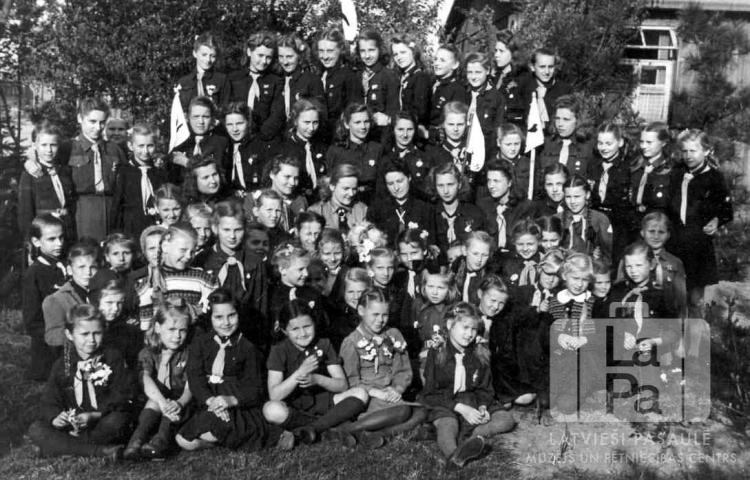 Liela meiteņu grupa gaidu formastērpos Oldenburgā (angļu zonā) 1947. gada vasarā. Labajā pusē aizmugurē ir redzama vienstāvu koka baraka.