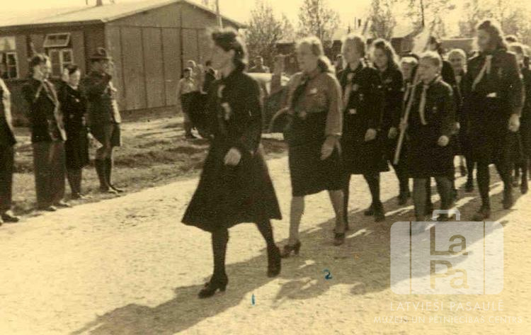 Mežotnes 11. gaidu vienības meitenes un sievietes formastērpos no Tērvetes nometnes Oldenburgā sveicina ielas malā esošos skatītājus gājiena laikā, kas notiek Baltiešu skautu un gaidu sanāksmes ietvaros Omstedes nometnē Oldenburgā (angļu zonā). Fonā ir redzamas vienstāvu barakas. Uz fotogrāfijas ar zilu krāsu ir uzrakstīti cipari "1" un "2". Gājienā soļo: pirmā Tērvetes gaidu novada priekšniece Tamāra Pujāte, otrā vadītāja vietniece Elizabete Eglāja. Ielas malā ierindā stāv, no kreisās: otrā angļu Sarkanā Krusta pārstāve A. Painters un trešais skautu vadītājs Gustavs Eglājs (ar skautu cepuri).