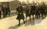Grupa gaidu formās soļo un sveicina. Aizmugurē nometnes barakas.
