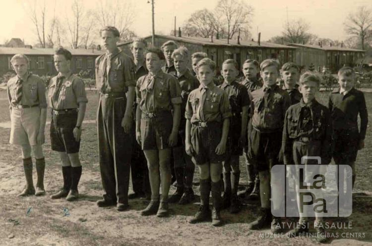 Divi pieaugušie un grupa zēni skautu formās stāv ierindā. Aizmugurē nometnes barakas.