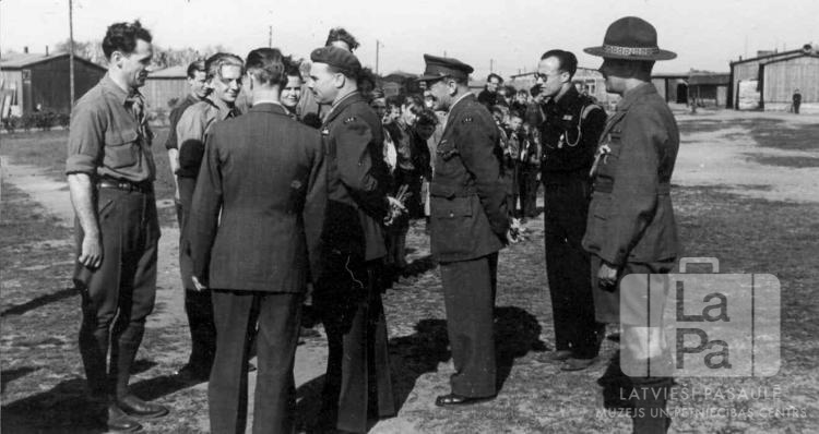 Grupa pieaugušie visādos formas tērpos. Aizmugurē nometnes barakas.
