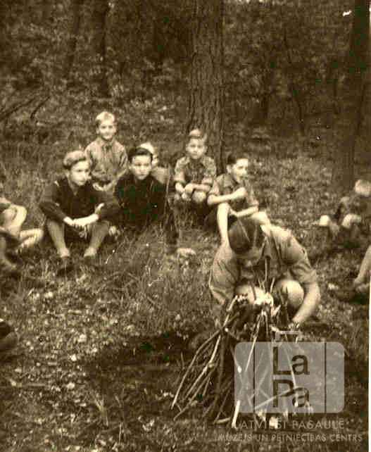 Garezera 116. skautu vienības skauti formastērpos no Tērvetes un Mežotnes nometnēm Oldenburgā (angļu zonā) sēž ap ugunskuru Vēnenes mežā. Viens skauts aizdedzina ugunskuru.