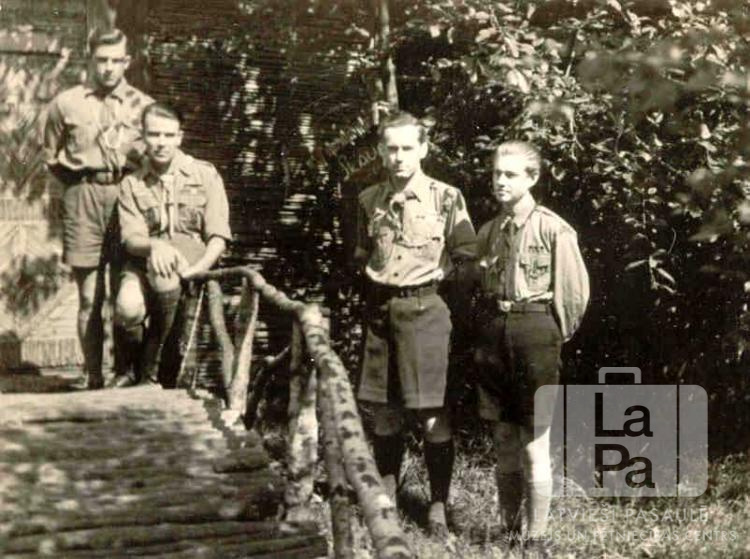 Četri vīrieši skautu formastērpos no Garezera 116. skautu vienības vadības Tērvetes un Mežotnes nometnēs stāv pie baļķu tilta Tērvetes nometnē Oldenburgā (angļu zonā). No kreisās: vadītāja vietnieks Ilmārs Mancs, vadītājs Gustavs Eglājs, vadītājs Elmārs Sproģis un vadītāja vietnieks Gunārs Šterns.
