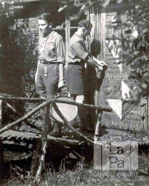 Divi skautu vadītāji formastērpos stāv uz baļķu tilta pie Garezera 116. skautu vienības mītnes barakas durvīm Tērvetes nometnē Oldenburgā (angļu zonā). Vienam vadītājam rokās ir bungas (?).
