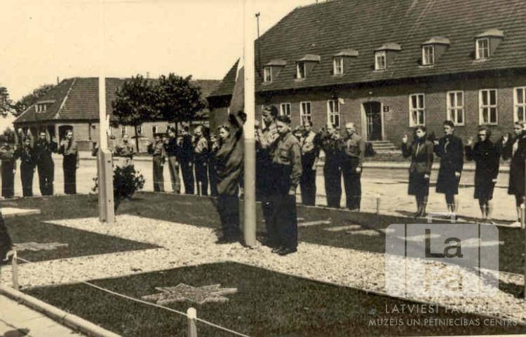 Trīs zēni skautu formastērpos stāv pie karoga masta Tērvetes skautu un gaidu novadu kopnieku – kopnieču kursu laikā Sengvardenes nometnē (angļu zonā) 1949. gadā no 27. līdz 30. maijam. Aizmugurē stāv skautu un gaidu ierinda, aiz viņiem ielas skats ar divstāvu mūra ēkām.